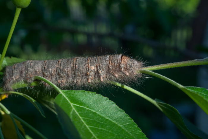 Вторая тихо спала на дачной яблоне  в г. Омске в том же году. Была найдена, растолкана палкой и сфотографирована. Это мохнатое бревно размером с мой указательный палец, а по диаметру еще толще. Было страшно)