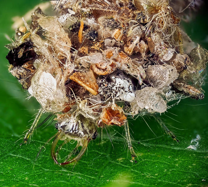 219 mikrofoto Лига любителей макрофото Мусорщик 6 лет назад Личинка златоглазки маскируетсяУвидел как свалка размером 3 мм двигается по листу.. [моё] Макросъемка Насекомые Маскировка Фотография