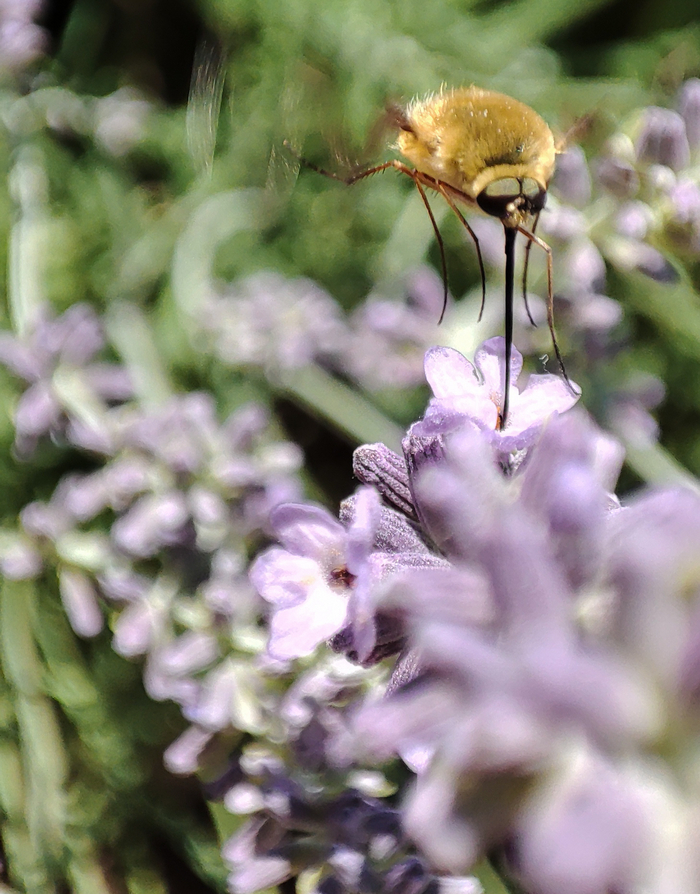Вот такое мохнатое и красивое насекомое с длинным хоботком питалось нектаром лаванды. К сожалению, сделать более чёткие фото не получилось, уж очень жужжало маленькое и шустрое, но такое симпатичное, что не могу не поделиться:)