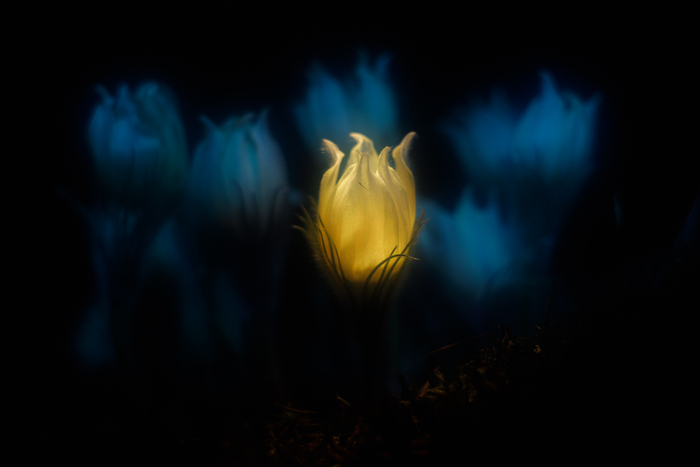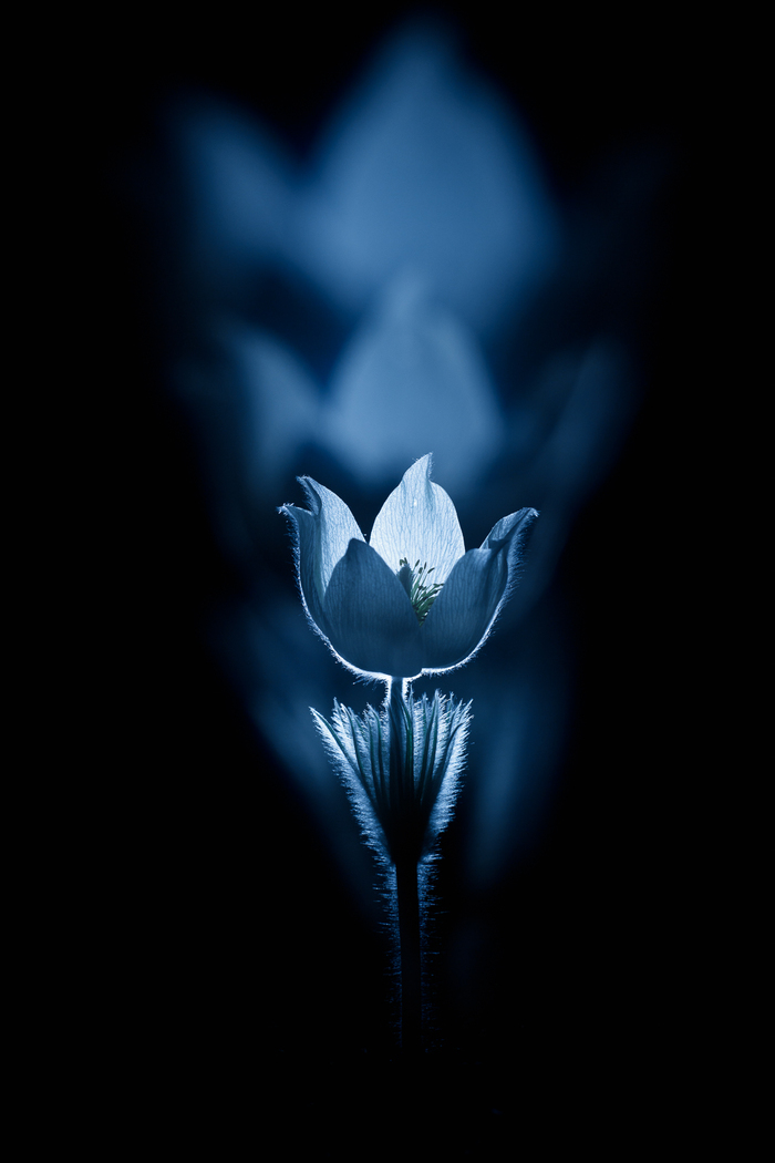 Вообще, из глобальных планов было поснимать распускающиеся папоротники и они обязательно ещё будут, но мимо цветущих прострелов пройти не было никаких душевных сил. Внутрикамерная мультиэкспозиция, подсветка фонариком.
