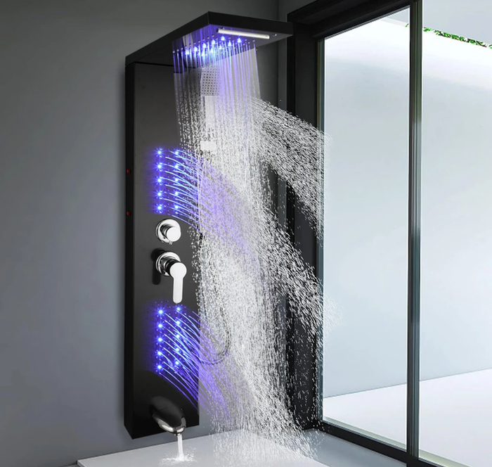 Внушительная система с верхним дождевым душем, водопадной струёй и LED-подсветкой. Оснащена гидромассажными форсунками и ручным душем. Корпус из нержавеющей стали устойчив к коррозии. Превращает обычный душ в полноценный спа-комплекс.