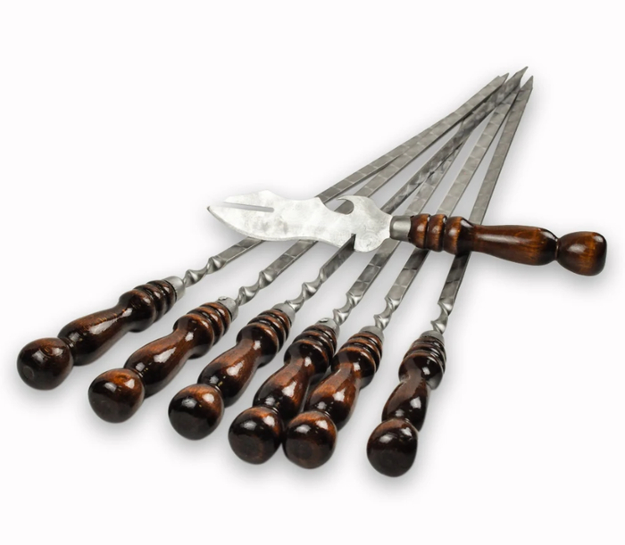 Качественные шампуры из нержавеющей стали с деревянными ручками для удобного захвата. В комплекте идёт специальный нож для нарезки мяса. Идеальны для пикников и дачного гриля. Устойчивы к жару и легко очищаются.
