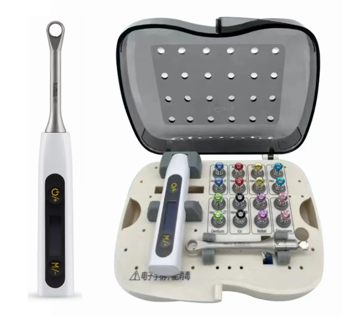 Инструмент создан для точного контроля усилия затяжки стоматологических винтов и имплантов. Работает в диапазоне 10–40 Нсм, что обеспечивает универсальность. Компактный и эргономичный корпус удобно ложится в руку. Электронная регулировка усилия делает процесс предсказуемым и безопасным.