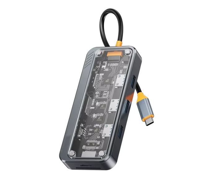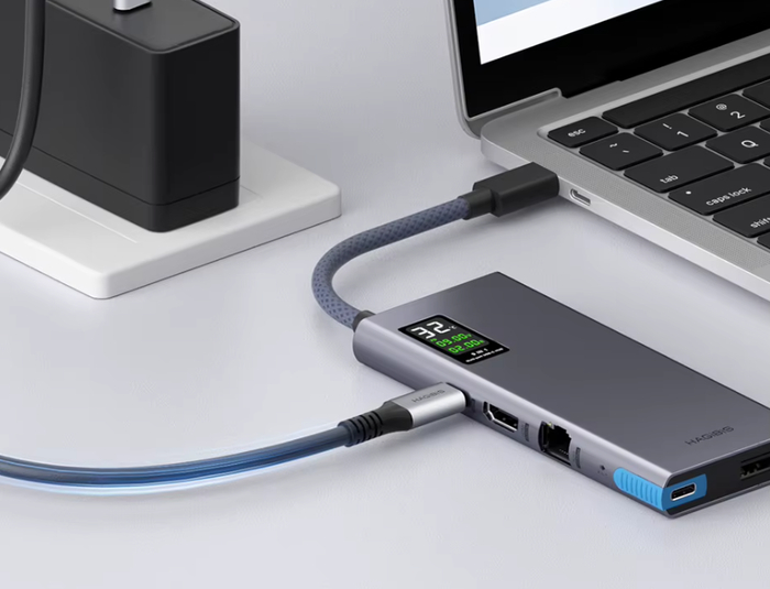 Сетевой адаптер на 65 Вт имеет два порта USB-C и один USB-A. Особенность — встроенный экран с анимацией, показывающей статус зарядки. Компактный, стильный и технологичный аксессуар. Идеально для одновременной зарядки ноутбука, телефона и наушников.