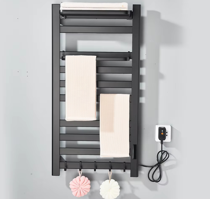 Компактный полотенцесушитель с подогревом до 70°C — отличный вариант для ванной комнаты. Имеет шесть перекладин и удобную складную стойку. Быстро сушит полотенца, создавая комфортный микроклимат. Совмещает практичность и компактность.