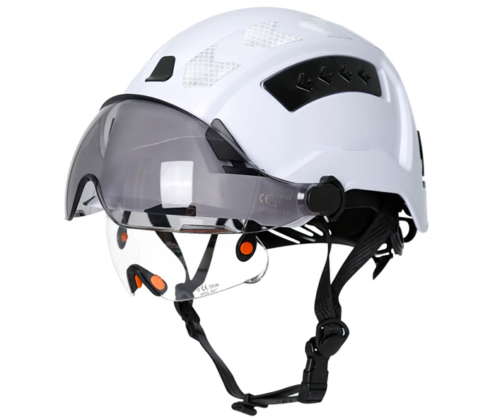 Шлем создан для защиты головы и глаз во время строительных, монтажных и инженерных работ. Корпус выполнен из ударопрочного материала, распределяющего нагрузку по поверхности при точечных ударах.