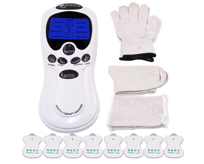 Центральный блок оснащён экраном, который отображает режимы, время и силу воздействия. Электроды плотно прилегают к коже и равномерно передают импульс, предотвращая резкие ощущения.