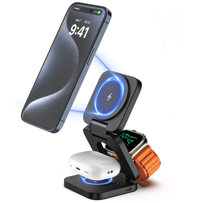 Многофункциональная станция заряжает одновременно iPhone, AirPods и iWatch. Поддержка MagSafe обеспечивает надёжную фиксацию и быструю зарядку. Компактный дизайн и минималистичный стиль делают устройство идеальным для прикроватной тумбы или офиса. Универсальность и эргономичность — главные плюсы модели.