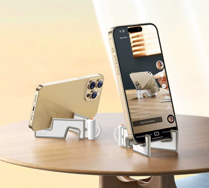Минималистичная складная подставка пригодится дома и в поездке. Поддерживает горизонтальное и вертикальное положение телефона. Благодаря ушку её можно прикрепить к связке ключей и всегда носить с собой. Надёжный пластиковый корпус выдерживает даже крупные смартфоны.