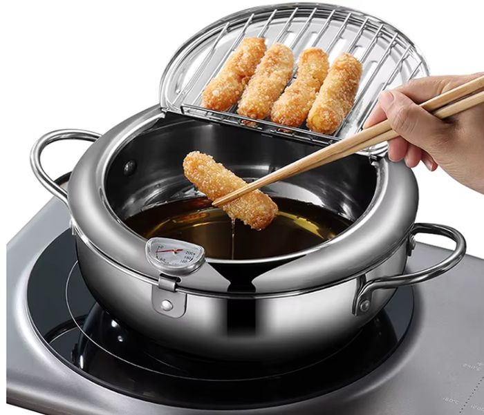 Массивная кастрюля с утолщённым дном равномерно распределяет тепло. Встроенный термометр помогает точно контролировать температуру. Можно использовать как сковороду или для тушения. Прочная ручка и крышка делают готовку удобной.