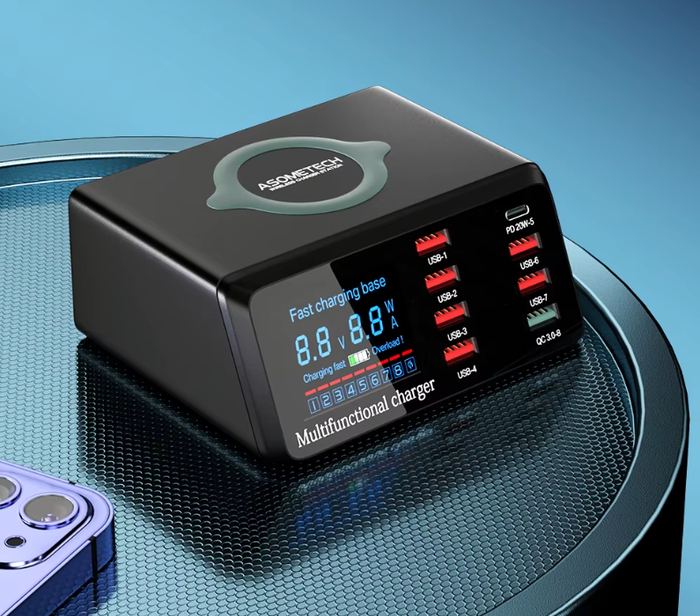 Устройство способно одновременно заряжать до восьми гаджетов. Оснащено цифровым дисплеем, который показывает данные о зарядке. Поддерживает технологии быстрой зарядки QC и PD. Подходит как для дома, так и для офиса.