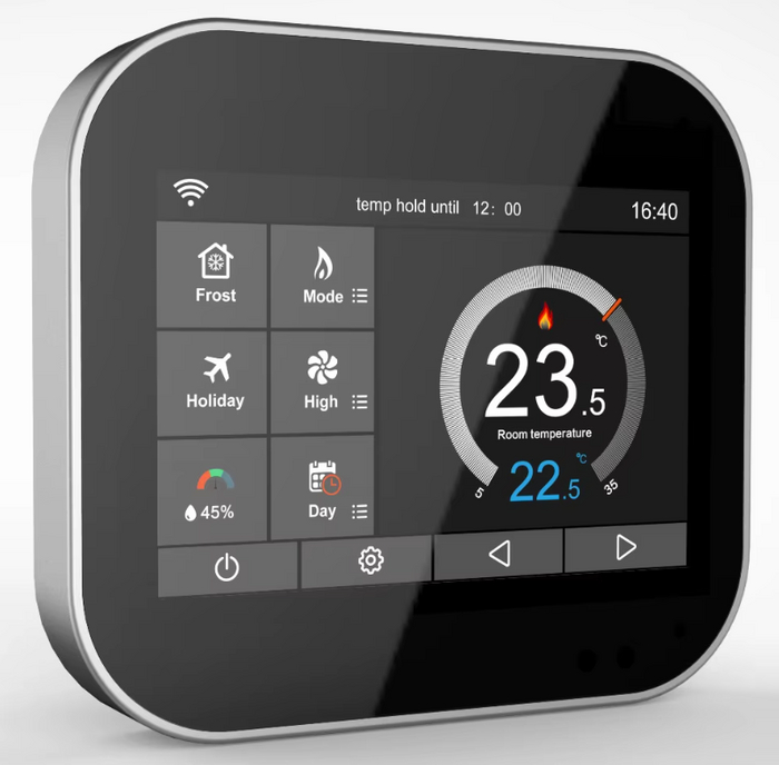 Термостат Modbus управляет системой электроподогрева с максимальной нагрузкой 16 А. Оснащен цветным сенсорным экраном и поддерживает несколько языков, включая английский, русский и другие, что облегчает его использование.