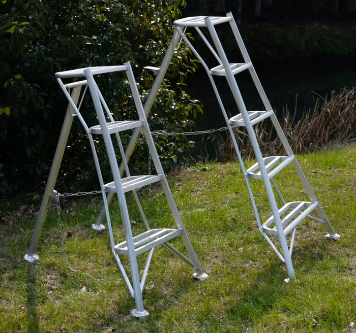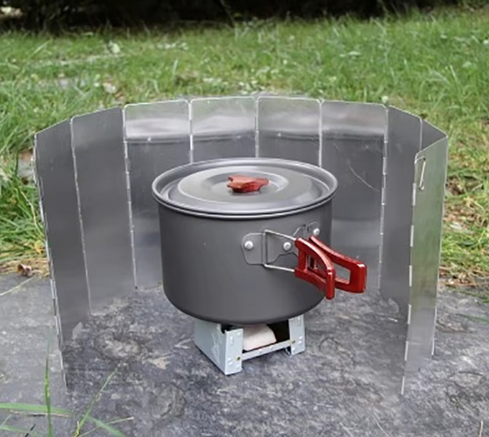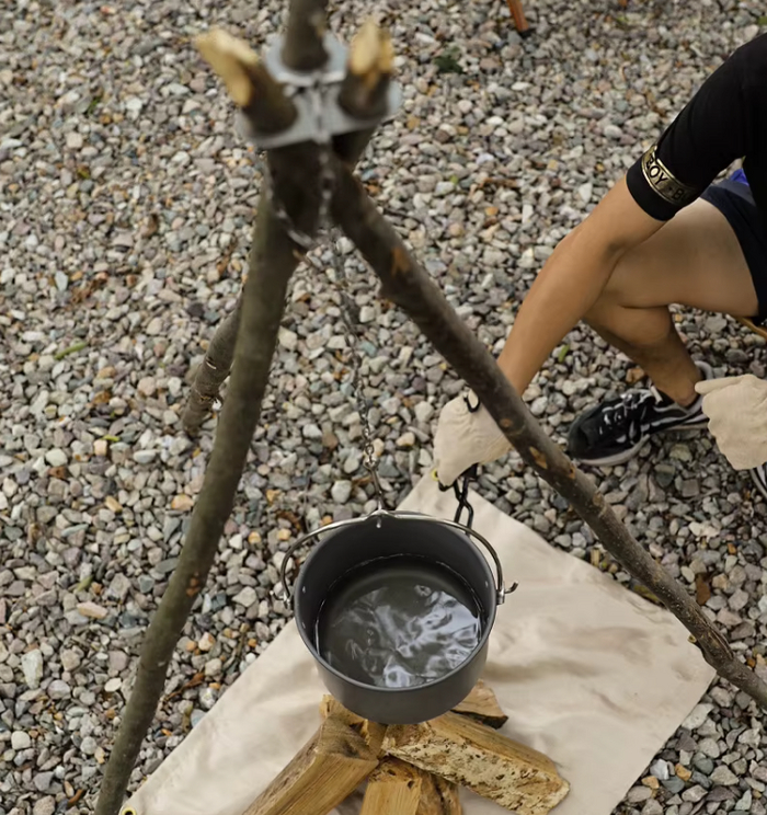 Приспособление для установки треноги над костром, позволяющее подвесить кастрюлю или котелок. Включает пластину с отверстиями для палок и крюк с цепью для подвешивания посуды.