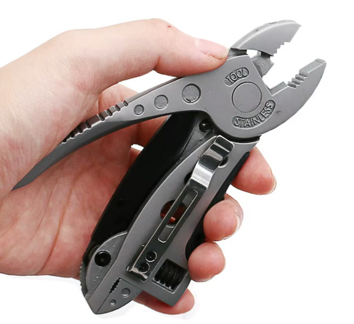 Молоток, сочетающий функции плоскогубцев, кусачек, газового ключа, отвертки и гвоздодера. Изготовлен из высокоуглеродистой стали с прорезиненными накладками на ручках.