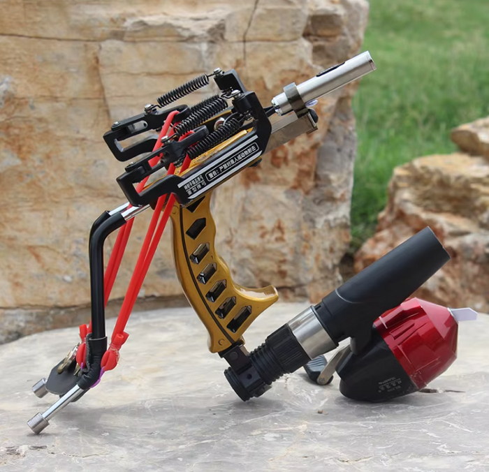 Рогатка с катушкой и лазером для прицеливания, предназначенная для боуфишинга. В комплекте поставляются стрелы. Важно учитывать законодательство о применении таких устройств в вашей стране или регионе.
