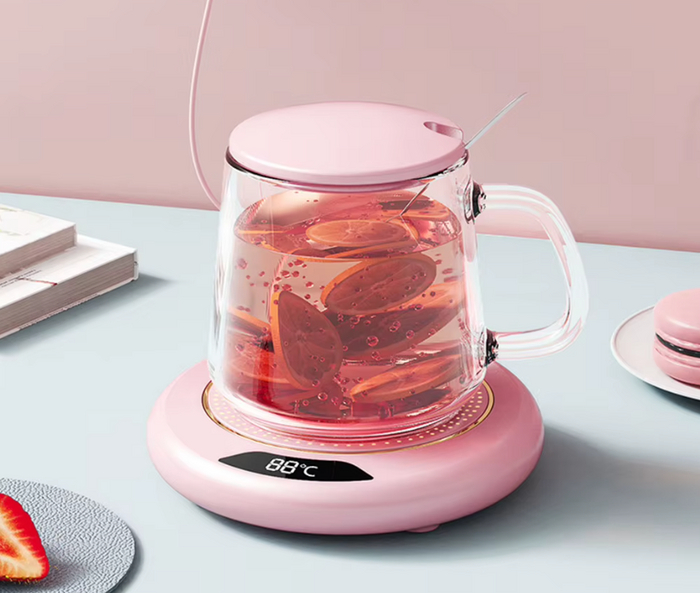 Кружка с электрической подставкой для подогрева, снабженная датчиком включения. Упаковка включает крышку и ложечку, идеально подходит для подарка.