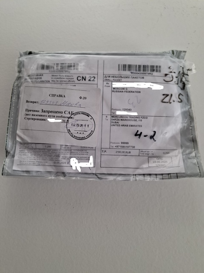 Однако из-за отсутствия наземной доставки в ОАЭ посылку отправили обратно отправителю, то есть мне. Я сразу связался с поддержкой Озона, они рекомендовали получить посылку и отправить её ещё раз только наземным способом. Я сильно спорить не стал, подумал, что они знают больше.