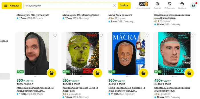 Уходим от какашки и переключаемся на последние тренды – сейчас очень популярны маски-чулки (например маска Якубовича, Стаса Михайлова или рандомного мужика). С ними снимают пранки, пугают домашних и просто веселятся. Предложения на эти маски есть на всех маркетплейсах, поэтому давайте сравнивать.