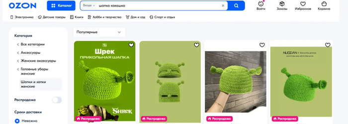 На Озоне какашку я не продавал – там я веду более дорогие бренды (и все таки опыт с кринжовыми вещами у меня там тоже есть, рассказываю ниже). Шапки какашки там нет, зато есть другие интересные предложения – например, балаклава Шрека. Это значит, что странные товары там тоже заходят.