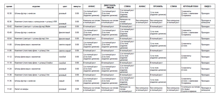 В планирование входит составление списка изделий, сразу присваиваем эти изделия моделям. Составляем последовательность, что за чем фотографируем.