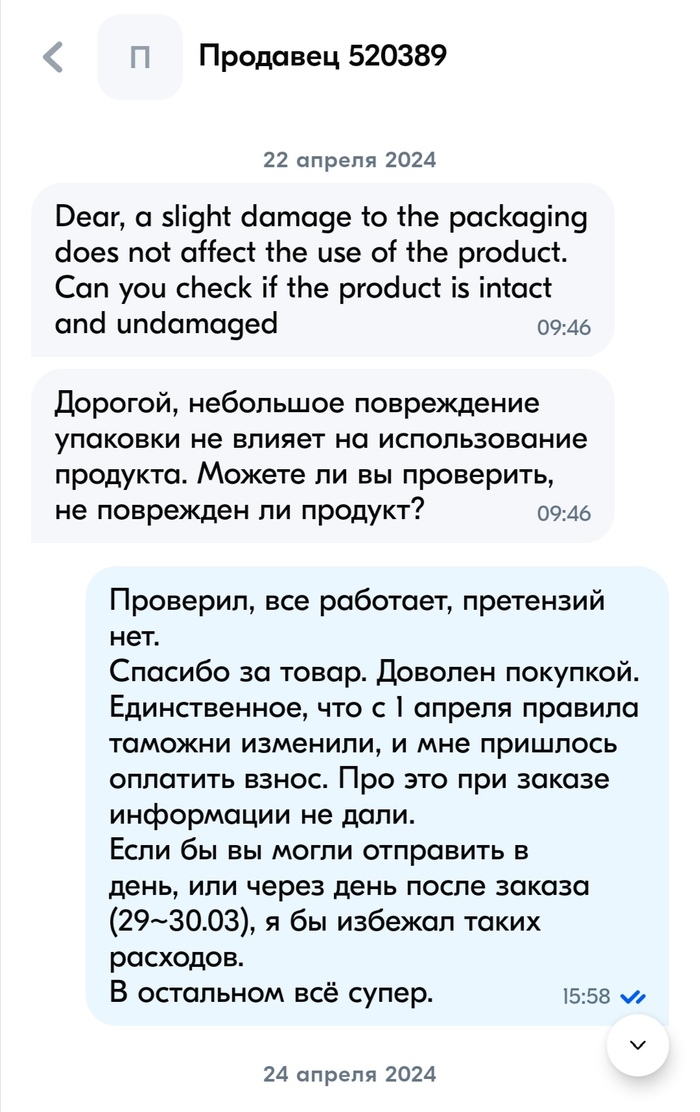 9. Вчера, 17.03.25 я отправил ссылку на этот пост продавцу через сообщения на озоне, чтобы поднять ему настроение, сегодня он ответил "Спасибо вам большое дорогой друг, если объем моего заказа увеличится, мы предоставим вам вознаграждение на нашей стороне." Надеюсь у него все хорошо и он заглянет сюда на огонек))