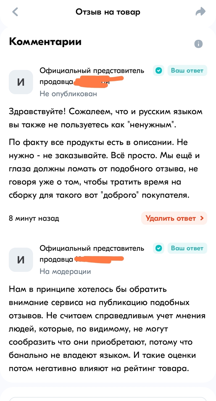 Я за 20 лет шопинга на ВБ (да и вообще в интернетах) впервые вижу такое хамство, даже захотелось поделиться, какие бывают клиентоДЕЗориентированные продавцы. Считаю, что с таким безобразием нужно бороться, прежде всего - рублем. Конкурентов - тьма, и перестать покупать у тех, кто не дорожит своей репутацией, считаю адекватной реакцией.