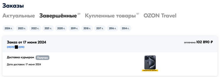 Походил я так немного с двумя телефонами и решился всё-таки купить себе новый iPhone, опять же, последнюю модель. Давно пора как бы, батарею не держит уже, обновления не приходят. Ну и начал, как всегда, искать, где выгодней. Несколько дней искал по всем площадкам и нашел несколько вариантов iPhone 15 Pro на 256 ГБ. Выбор был между парой вариантов на @Ozon, и еще каким-то маркетплейсом. Добавил всё это дело в закладки и никак не мог решиться, какой взять и где. Обращал внимание и на отзывы, и на продавца, товар дорогой всё-таки. Прошла ещё пара дней раздумий и решил ещё раз перед покупкой прошерстить озон, вдруг чего найду. И нашёл! Самое выгодное предложение, да ещё не просто от ноунейм продавца, а от самого Ozon Express. Да ещё и со скидкой, да ещё и распродажа, да ещё и дешевле с озон картой! И привезут прям курьером через пару часов. Ну, думаю, всё, поймал момент, надо брать. Закинул деняк на озон карту, 100500 раз всё перепроверил (сумма немаленькая, однако) и нажал оформить заказ.