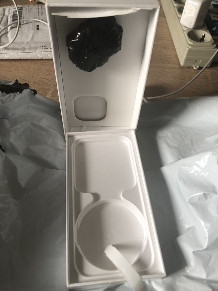 Курьер начинает съёмку, а я начинаю распаковывать. Пакет запаян, хотел разорвать, но смотрю, небольшая дырка в пакете, ну, думаю, её и дорву, чтобы коробку вытащить. Вытаскиваю, вроде что-то там есть по весу и немного болтается даже. Смотрю внешнее состояние, ну вроде модель та, цвет тот, объём памяти тот, всё верно. Был у меня при себе ещё ультрафиолетовый диод и батарейка CR2032 (насмотрелся я перед этим, как проверить коробку). Свечу в углы коробки, да, надпись iPhone и QR-коды или что-то такое там просвечивается. Как только я начал светить в нижней стороне, смотрю, дно коробки, где защитные стикеры, как-то странно выпирает. Смотрю внимательней и вижу, что вот эта нижняя часть коробки оторвана от стенок верхней части, причём защитные полоски целые. Начинаю выдирать нижнюю часть, не очень удаётся, поэтому отрываю полоску за дёргалку и приоткрываю. И что я вижу? Кусок чего-то в чёрной изоленте (интересно, почему не синей…). Сначала подумал, может это ***котики и уже омон где-то за дверью, но как оказалось, это просто кусок асфальта. КУСОК, МАТЬ ЕГО, АСФАЛЬТА вместо айфона за 102 тысячи рублей.