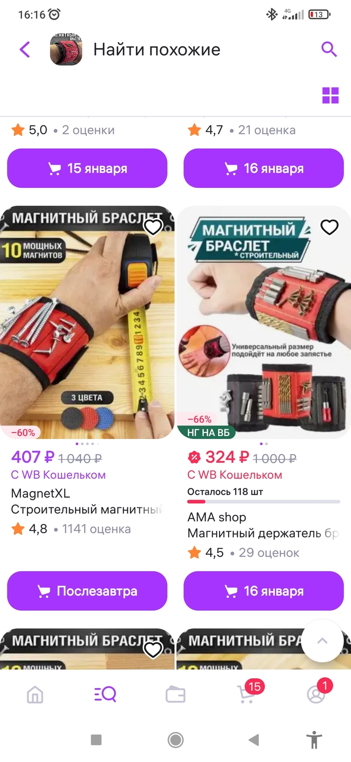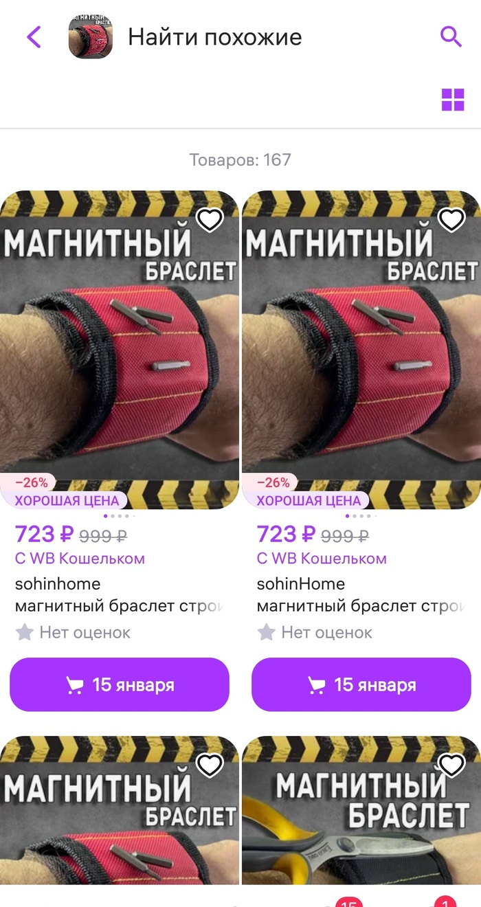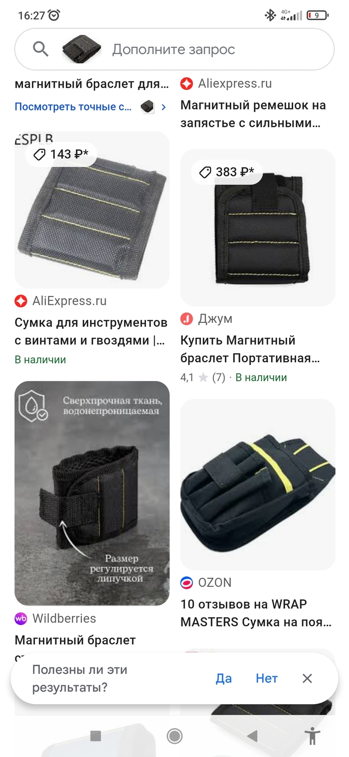 Пролистав несколько страниц выдачи я понимаю, что даже здесь есть явные лидеры в виде магнитных брусков для ножей с низкой ценой и высоким рейтингом, поэтому мой взгляд зацепил браслет для инструментов на руку. Пробую найти отдельно такие браслеты и тут остаётся чуть больше 100 товаров