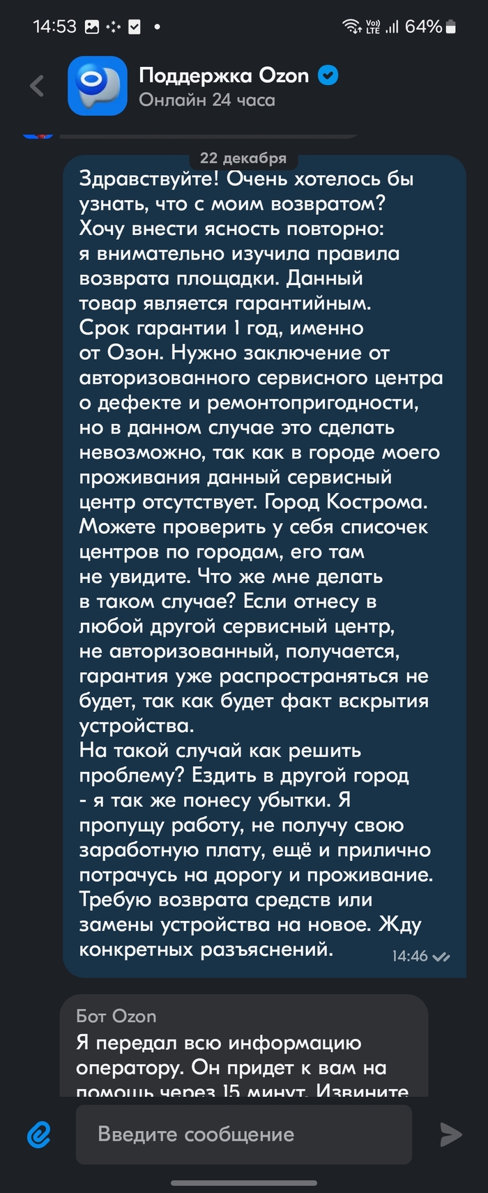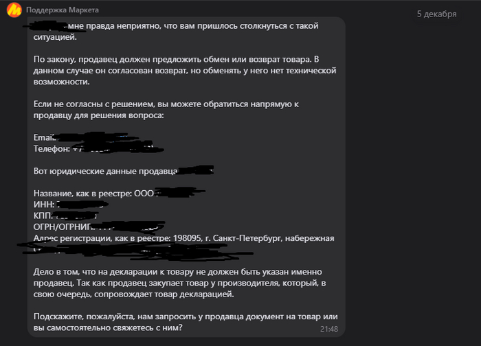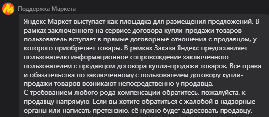 @Yandex.Market, Простите, а какое нарушение упаковки вы хотите проверять исключительно после возврата, когда вам на видео показали, что пломба вскрыта и в дальнейшем полностью распаковали товар? Положите упаковку в машину времени и проверите, какой она была на момент отправки/доставки? Впрочем это уже показывает, что приложенное видео вы явно не открывали. Это, кстати говоря, был фактически последний ответ от поддержки. После этого вопросы банально игнорировались, как и правила маркетплейса. Самое забавное, что у них никто и не просил вернуть деньги за товар так как цель была другой.