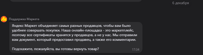Конечно после таких ответов я обратился в роспотребнадзор и на линию антиконтрафакт. И самое интересное - после этого момента яндекс маркет начал настойчиво просить вернуть им товар. Видимо, что бы вещественных доказательств у меня на руках не осталось, но так как решили обращаться в роскомнадзор оставили накопитель у себя. А маркетплейс даже решил уточнить, сможет ли продавец заменить ссд на тот, который и заказывали:
