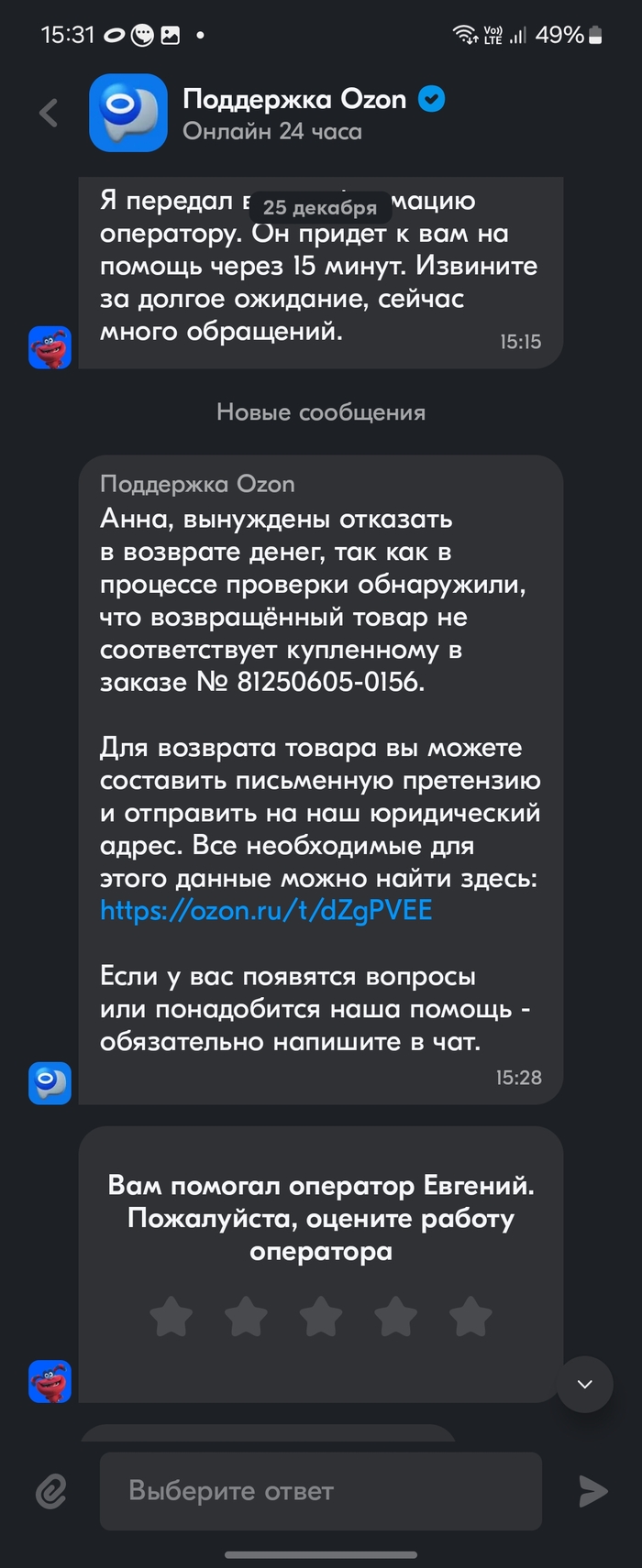 Почему не согласились на возврат. Ну тут достаточно просто. После того как поддержка промариновала нас несколько дней, прислала документ, который нарушает их же собственные правила и только спустя ещё два дня решила соизволить дать разрешение на возврат (а это уже 12 дней с момента заказа), то тут уже пошло принципиальное желание наказать продавца, так как данное действие предполагает штраф, и убрать хотя бы одного продавца контрафакта. Жаль, что из-за защиты продавца маркетплейсом это затягивается.