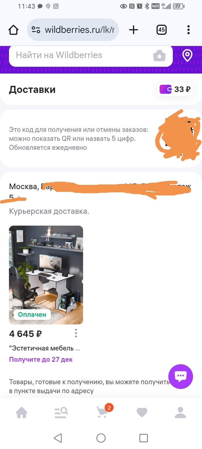 Ну что, слилась Бакальчук с какими-то армянами, и началось, я так понимаю. Хотя может так всегда было? Стол компьютерный ребёнок захотел с вайлдберрис. На других площадках я его не нашла, может плохо искала, кароче, решила заказать на ВБ. Доставка была обещана в воскресенье 15.12, как раз выходной, кто-то да дома. До 10 вечера так заказ и не был передан в доставку. В поддержке написали, что курьеры загружены, поэтому как тока передадут, так передадут. Я пишу - а когда передадут? Робот - ну как передадут, так сразу. Я - так что, может даже не завтра передадут?? В этот раз оператор ответил - должны передать завтра, не передадут, тогда пишите нам. В 10:58 начинаю писать. Ибо не передано в доставку. Робот отвечает, что дату доставки смотрите в таком-то разделе. А там даты доставки нет вообще. Вчера до последнего была дата 15.12.24, а сегодня так: просто курьерская доставка, вчера была дата, сегодня хуй, и ниже написано идите получайте на пункте получения. Ну да, я для этого габаритный тяжёлый товар заказывала с доставкой, чтобы пиздючить его на себе.