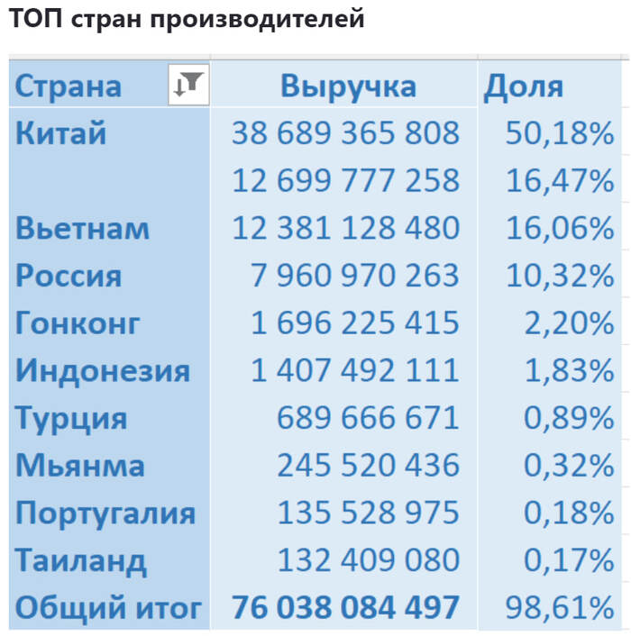- 50,18% всех товаров категории производится в Китае, в Росси только 10,32%