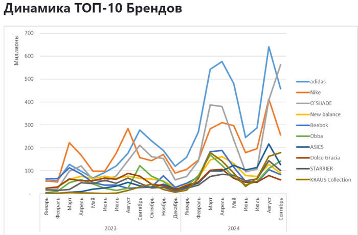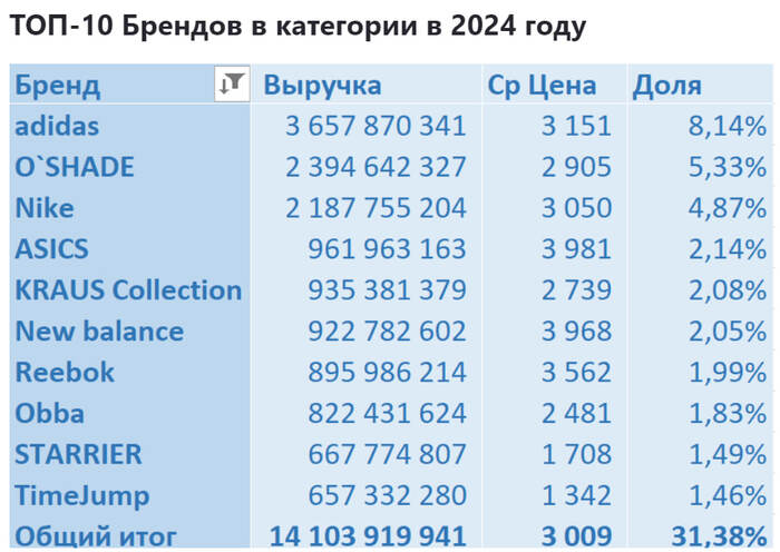 - Среди брендов явный лидер adidas с долей 8,14% который почти в 2 раза опережает Nike 4.87%. ООО Вайлдберриз торгует 77 брендами.