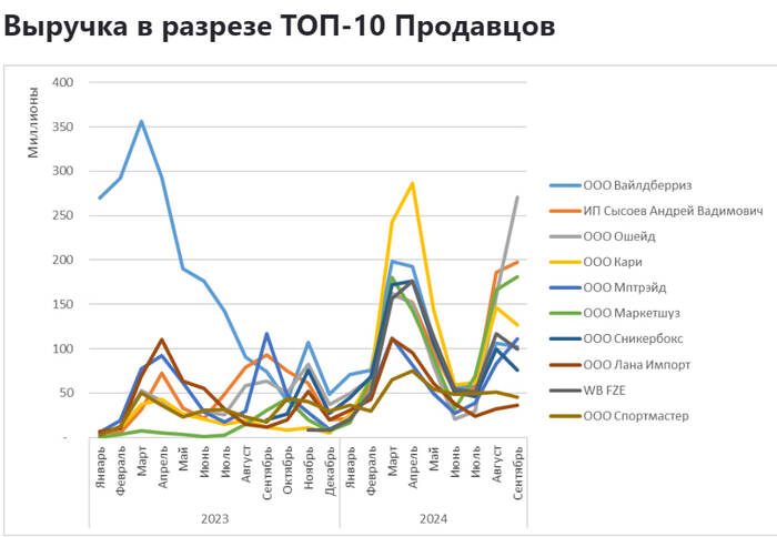 - ТОП-10 Продавцов занимают 18,3% объёма категории по выручке.