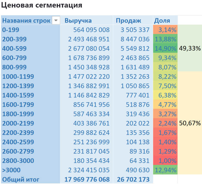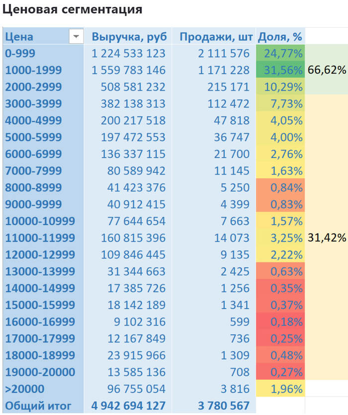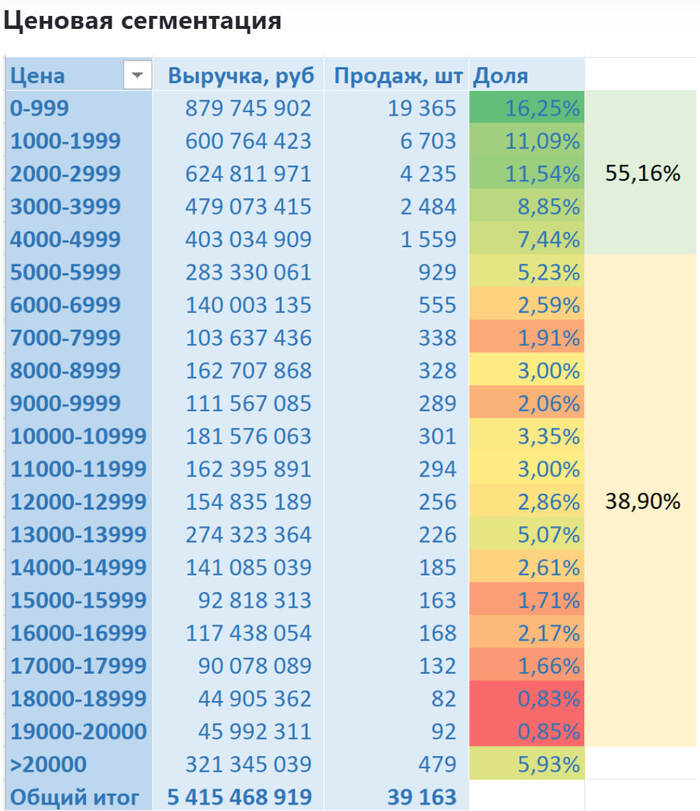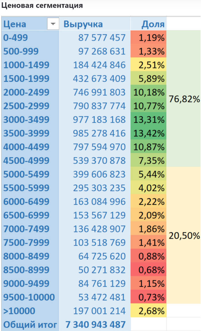 - 77% товаров продаётся дешевле 5 000 руб. и почти 97% дешевле 10 000 руб.