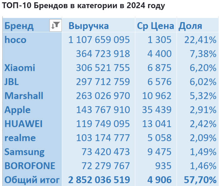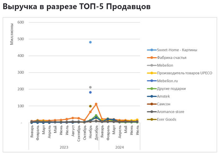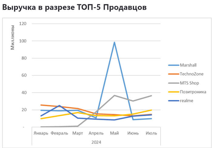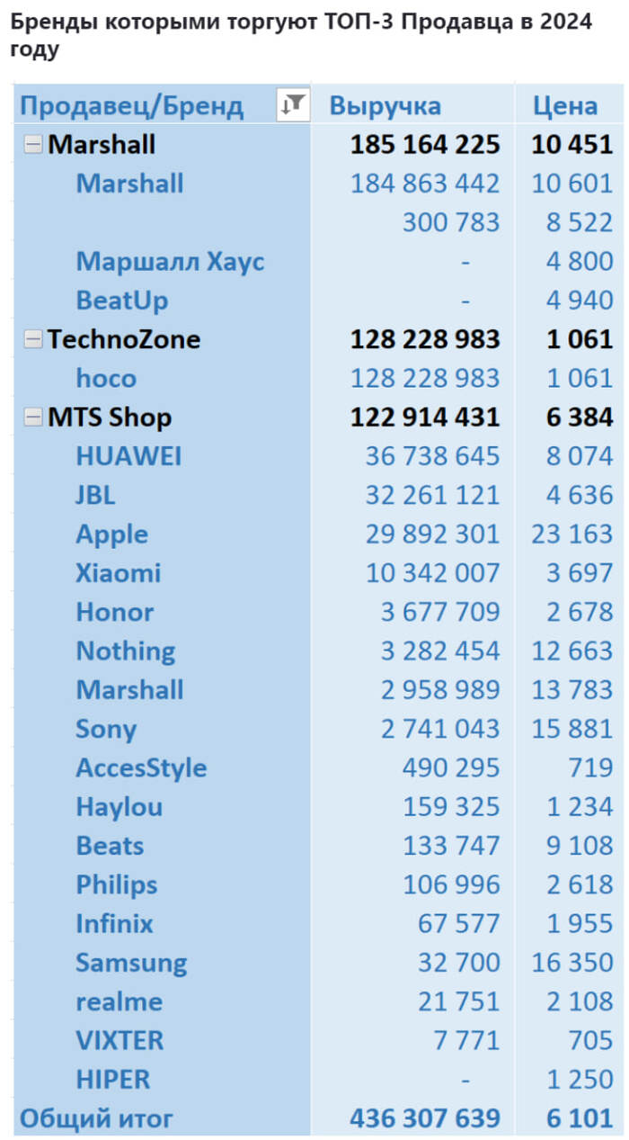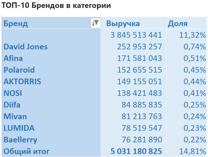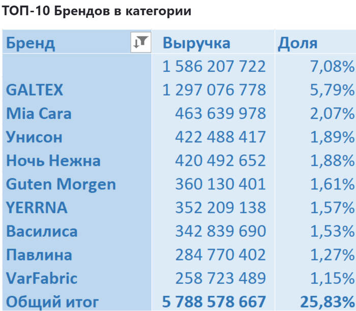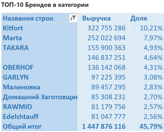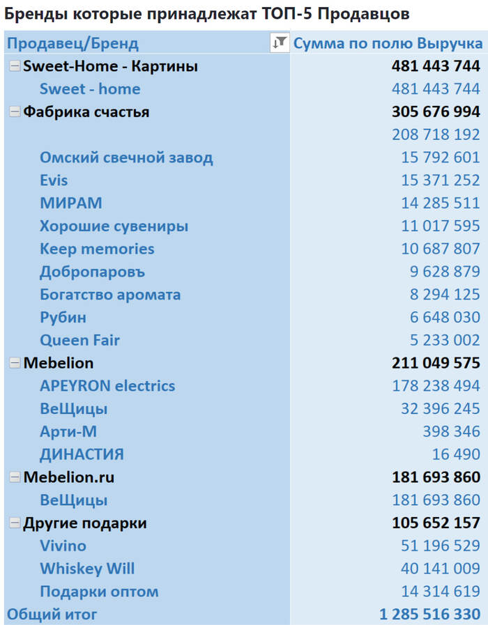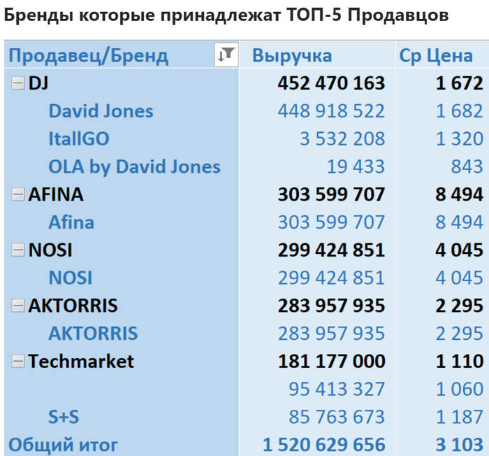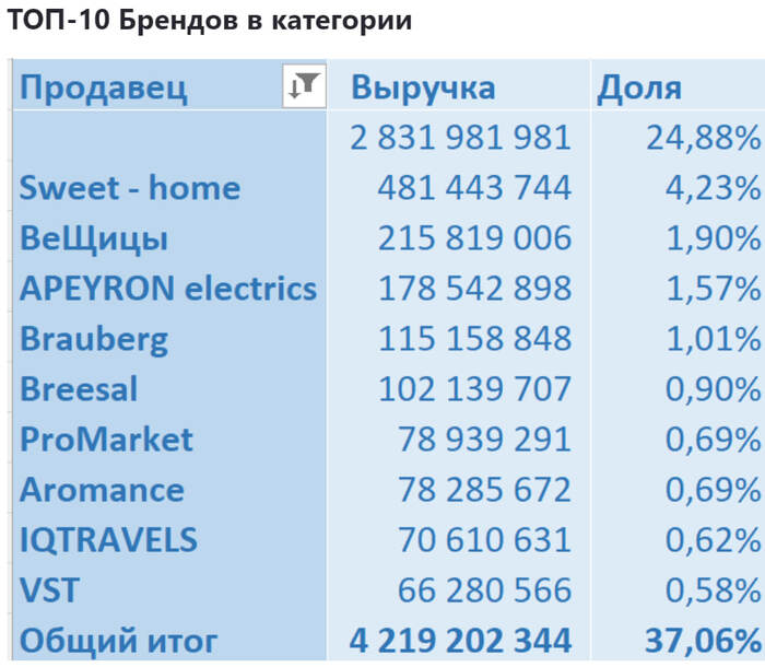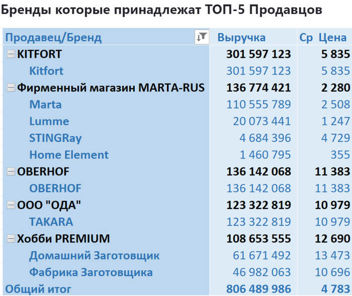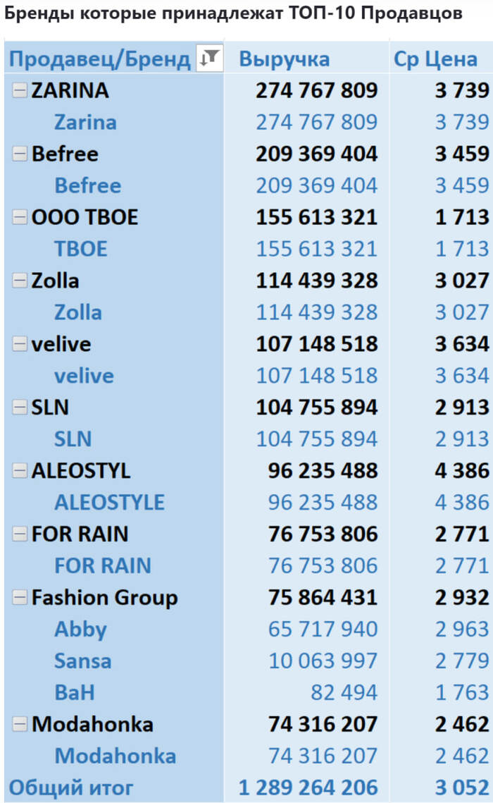 - 9 из 10 Продавцов из ТОП-10 по выручке торгуют одним Брендом
