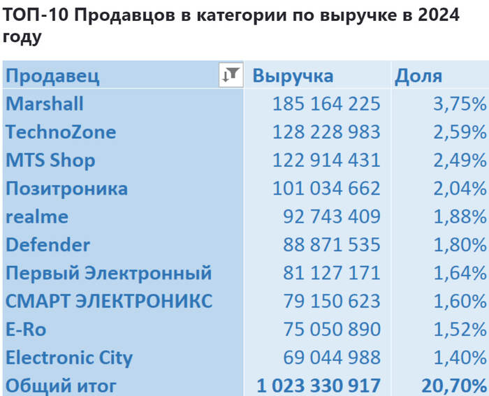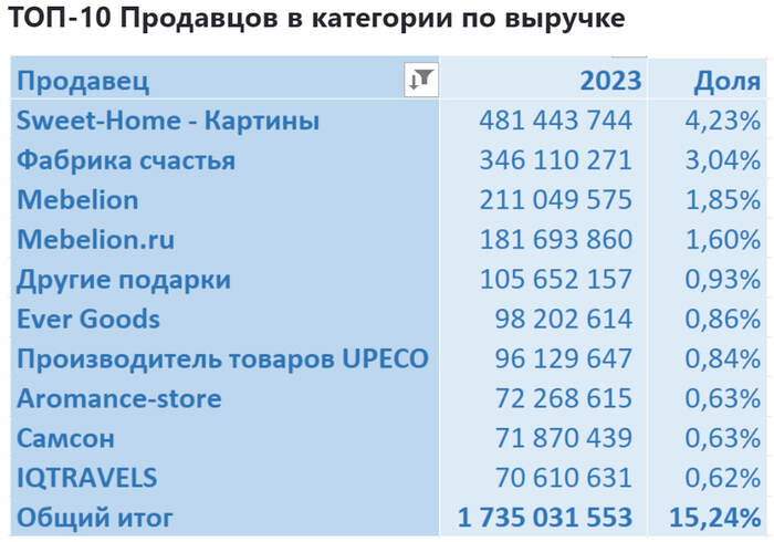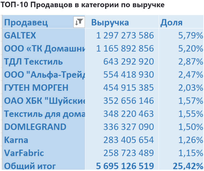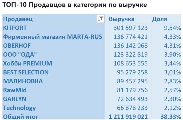 - ТОП-10 Продавцов занимают 27,3% объёма категории по выручке.