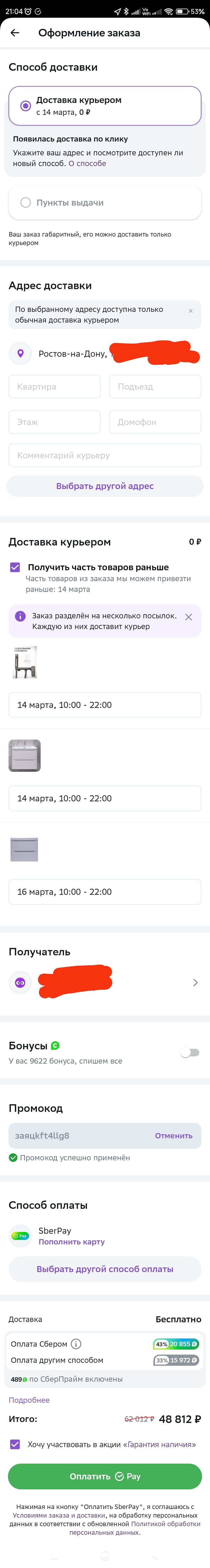 Но, все по порядку: сделал заказ на 19к, заказ был разбит на 3 части: брал варочную панель, набор дешевых инструментов и краны для ванны. панель получил (за нее как раз обещали более 2000 бонусов), инструменты тоже. Краны получить не смог, так как хоть заказ и пришел в пункт выдачи, но смс с кодом получения не было (у них были какие-то проблемы), получить используя приложения не смог, получить код по средству звонка на горячую линию тоже. Проблема была еще в том, что зная, что заказ уже пришел с кранами - позвал платного сантехника на установку. В итоге сантехник должен придти, заказ с кранами в пункте выдачи, но получить его не могу. Отменил эту часть заказа и купил краны в офлайн магазине...
