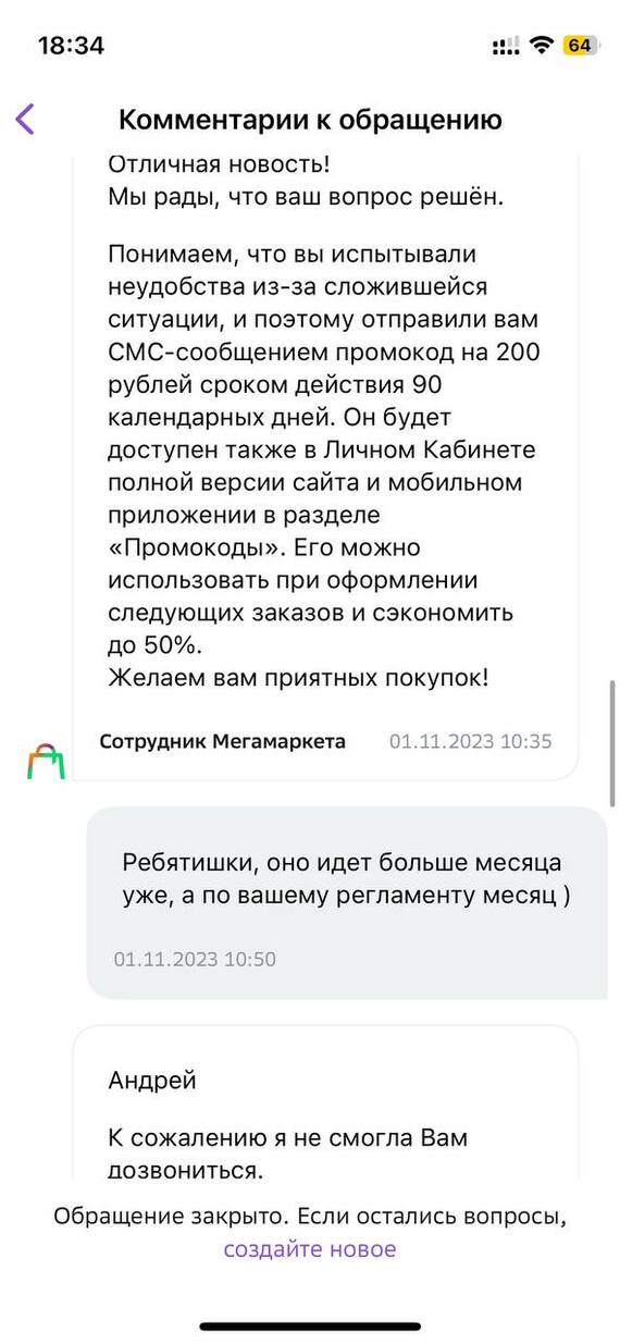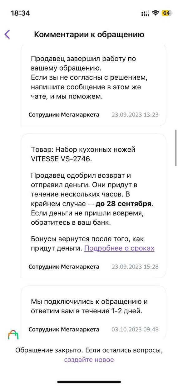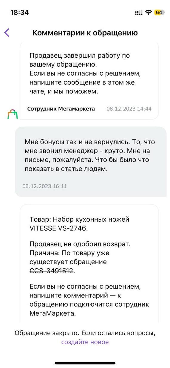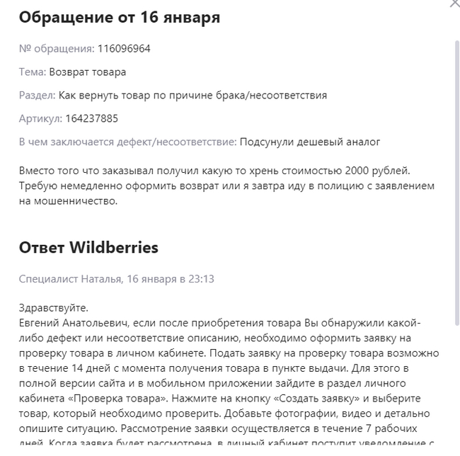 25.11 2023 открыла обращение, т.к. получила не тот товар. Обращение ccs -4602419. Обращение до сих пор не рассмотрено. Обращение без причины постоянно закрывается( может быть просто закрыто через час после переоткрытия). Операторы ничего не знают- ни причин закрытия, ни сроков рассмотрения. С 18 января у меня в приложении к данному обращению вообще отключили комментарии, я их ни не вижу, ни писать не могу. Операторы постоянно вводят в заблуждение (из последнего 18 января утверждали что проблема с коментариям локальная ошибка а так все в порядке. 20 января мне сообщили о том что коментарии отключили намерено) Вопрос не решается никак. Жалобу нельзя оставить ни на специалистов, занимающихся обращениями ( если они есть, судя по тому что за 2 месяца ситуация вообще не сдвинулось- их нет), ни на операторов (общалась в соцсетях) которые предоставляют ложную информацию- каждый раз меняющуюся.