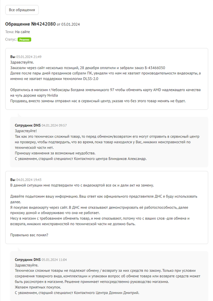 Для ЛЛ - если вы купили не рабочую видеокарту в днс дистанционным способом, то вам могут поменять её, а могут и не поменять.