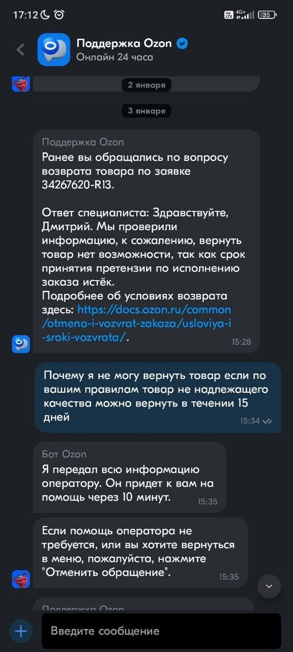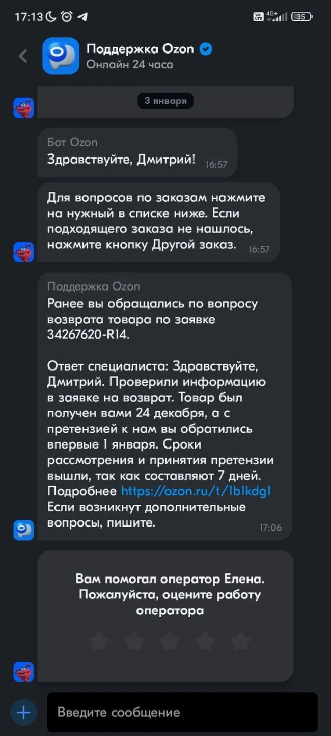 1 Января оставил заявку на возврат товара, в ответе на заявку меня попросили прислать больше фотографий, о чем я заметил не сразу, поэтому заявку закрыли.