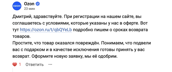 Как Озон отказывается возвращать деньги за разбитый подарок Маме1