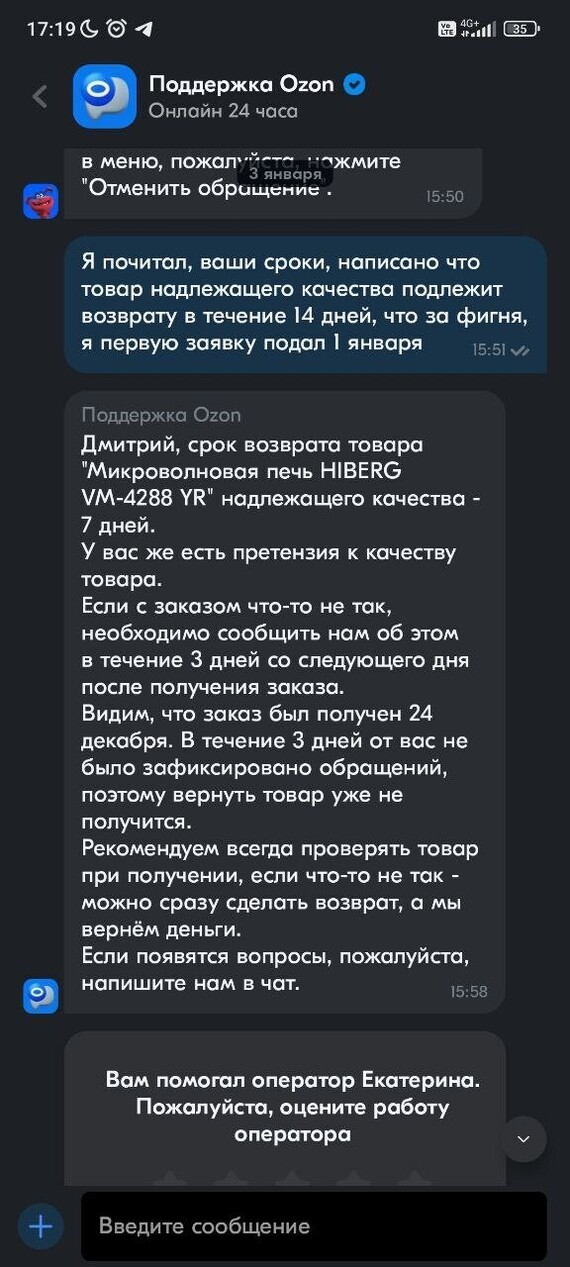 Купил подарок Маме на новый год - микроволновку, оказалось что она разбитая, Озон отказывается возвращать деньги и ссылается на правило - не написали о повреждении за 3 дня - поэтому возврат невозможен. Насколько я знаю, по закону, возврат товара ненадлежащего качества возможен в течении 15 дней, я оперирую к закону, а не к внутренним правилам площадки, но в итоге получил отказ на возврат средств и теперь даже не знаю что делать.