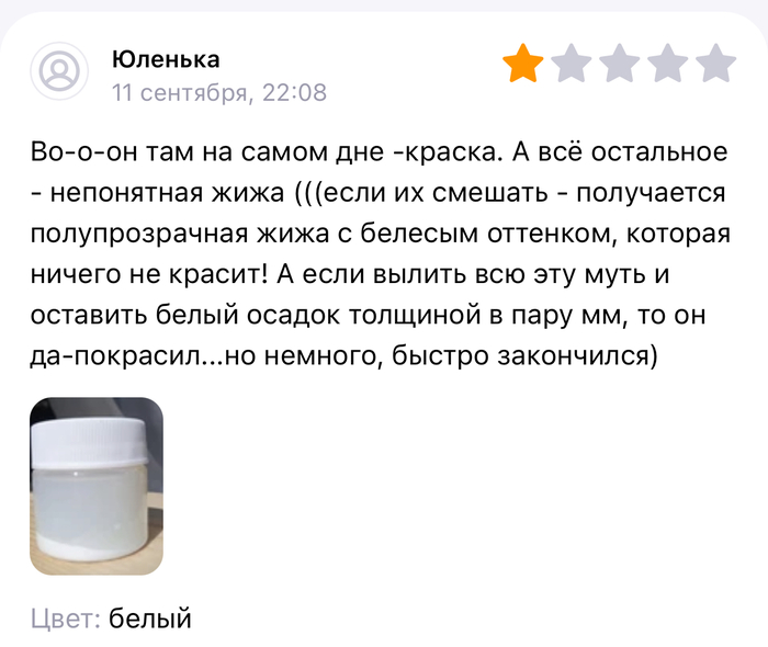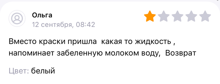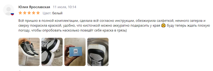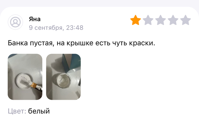 Как только наша компания вошла в ТОП-10 благодаря успешному внешнему продвижению — тут же через 2 дня мы получаем негативный отзыв с 1 звездой. Низкая оценка была обоснована тем, что банка пришла пустой. Однако, если обратить внимание на фотографию, можно увидеть, что коробка от баночки с краской осталась в идеальном состоянии несмотря на то, что при наличии пролива она была бы повреждена. И еще одно доказательство: краска на стенках баночки выглядит свежей. Однако она бы высохла за сутки, если бы из емкости вылилось основное содержимое (а именно растворитель полимера). А значит ее вылили за несколько минут до того, как сделать фото.