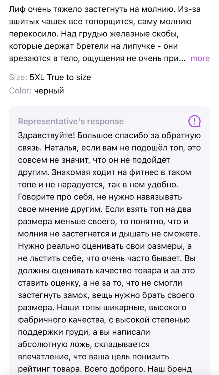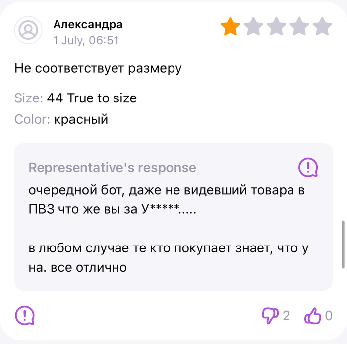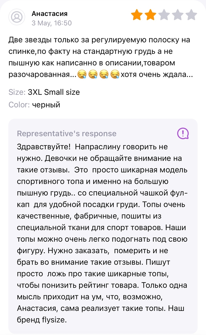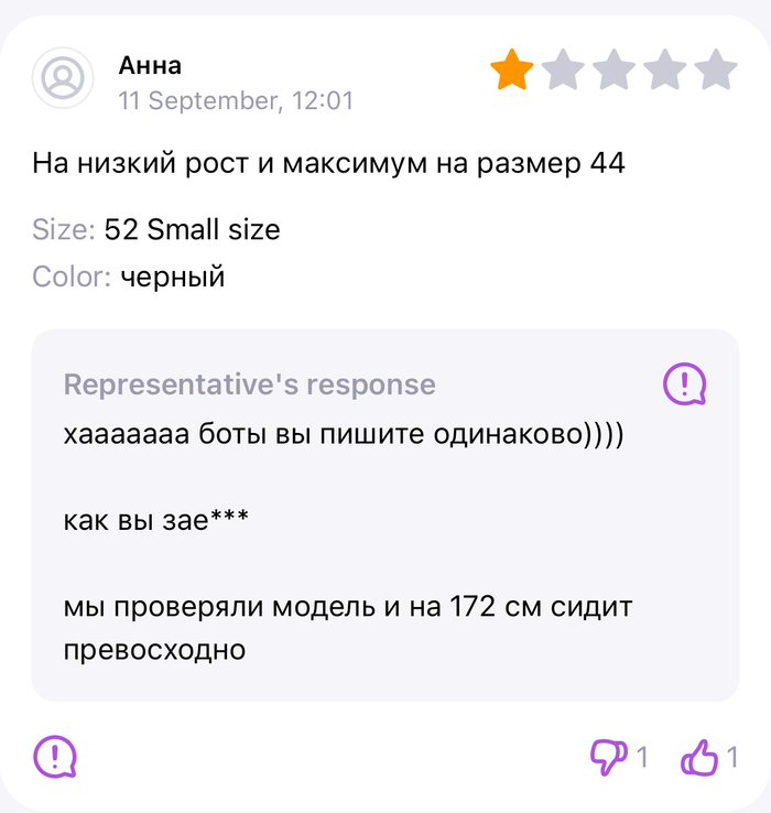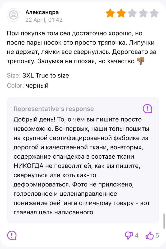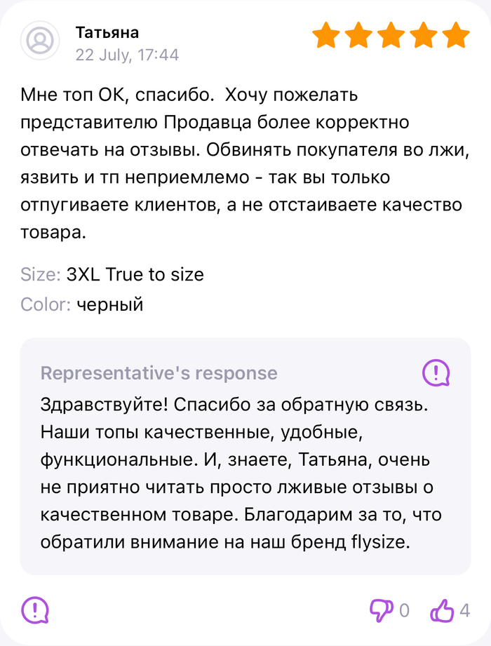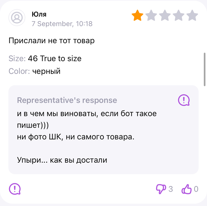 Понятно, что есть неадекватные покупатели с неадекватными отзывами. Но когда любой отзыв с низкой оценкой вызывает такую агрессию - это показывает низкий уровень социальной культуры продавца.