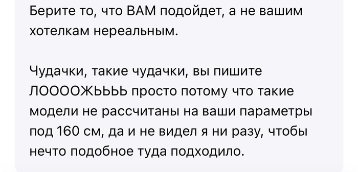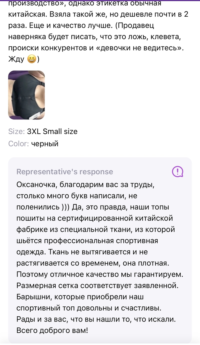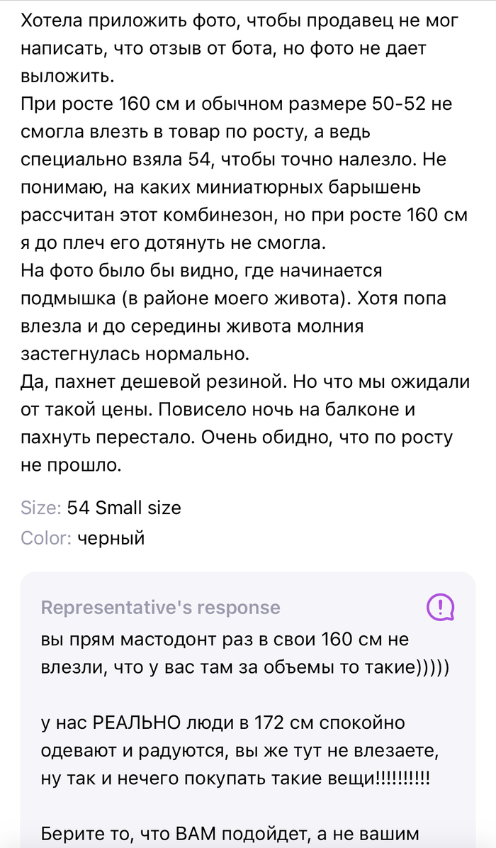 Неужели они считают, что, прочитав ответ на отзыв типа «девочки не ведитесь, это боты, лохи и происки конкурентов пытаются впихнуть свою жирную жопу в наш прекрасный костюм», покупатели такие «о супер! Я не бот, не лох, и жопа не жирная, значит беру, спасибо продавцу, открыл глаза»? У меня такие ответы продавцов только отбивают желание приносить им прибыль. Ты покупаешь какую-то фигню у китайцев за 100 рублей, продаешь за 1000, да радуйся, чего на говно исходиться?