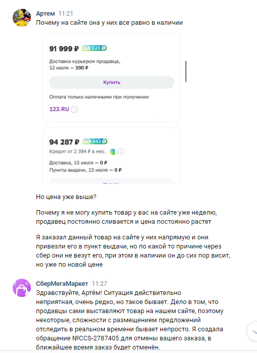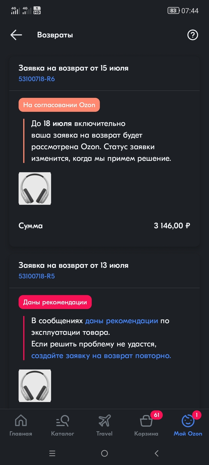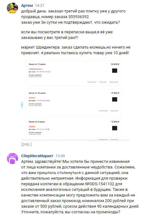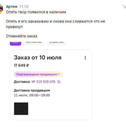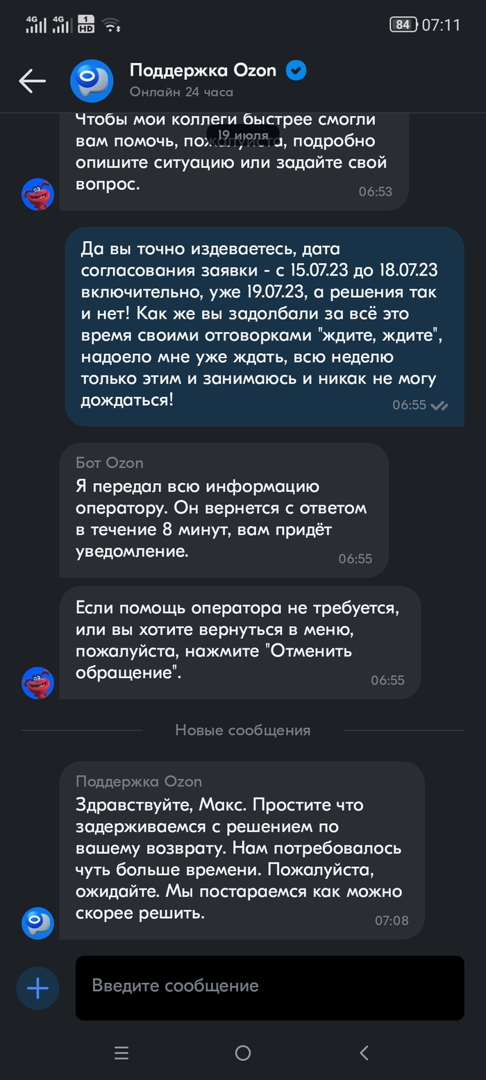 Т. Е. Вы сами отменяете мои прошлые заявки, требуете, чтобы выбирал категорию "не работает/плохо работает", потом тянете специально время (заказ пришел 11.07.23, до 18.07.23 я спокойно мог создавать заявки. Последняя заявка была от 15.07.23 включительно до 18.07.23, т.е. даже если бы была отмена - я мог еще одну создать. Но нет, резину тянули дальше, решение даже 19.07.23 не было до 23:00, чтобы наверняка уже не получилось создать еще одну)