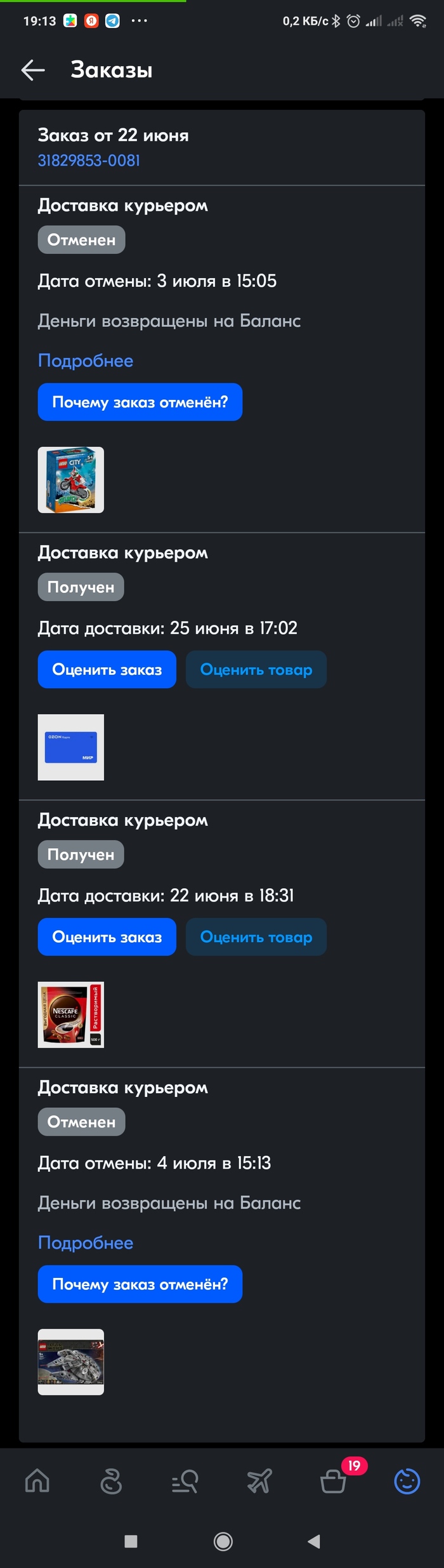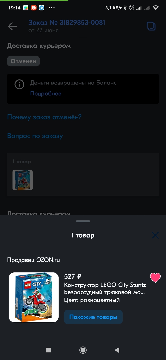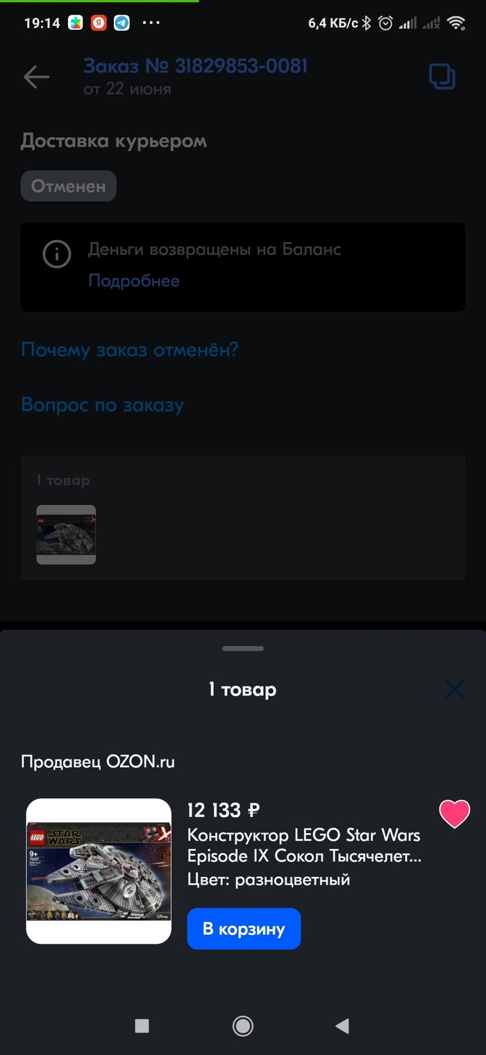Оформил заказ 22 июня на озоне подарок брату и сыну ко дню рождения, 31829853-0081, главное в этом заказе был Лего мотоцикл с фигуркой и Лего Сокол Тысячелетия! В заказе была также мелочёвка, кофе на их экспрессе, также реклама их карты, поэтому решил и ее сразу оформить.